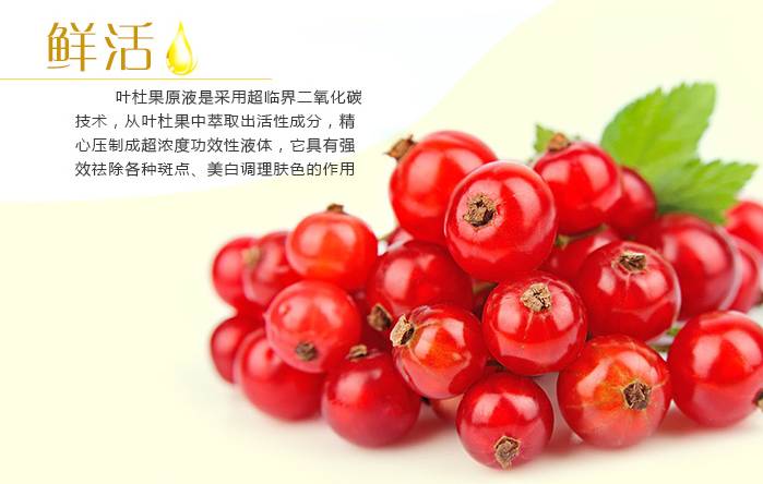 叶杜果原液是采用超临界二氧化碳技术萃取自叶杜果精华的高纯功效性液体,是一种卓越的“黑色素特理效应捕捉元素”(Anti-Melanis Element),对基底层黑色素所分泌的酪胺酸(L-Tyrosinanse)有整合作用,破坏整个黑斑形成的多巴(DOPA)反应程式,是黑色素捕捉器,通过排毒活肤、除皱嫩肤、色素均衡,达到美白淡斑,去除色素沉着的目的。叶杜果原液是纯天然植物提纯液体,作用于肌肤不会引起过敏,敏感肌同样可以使用。